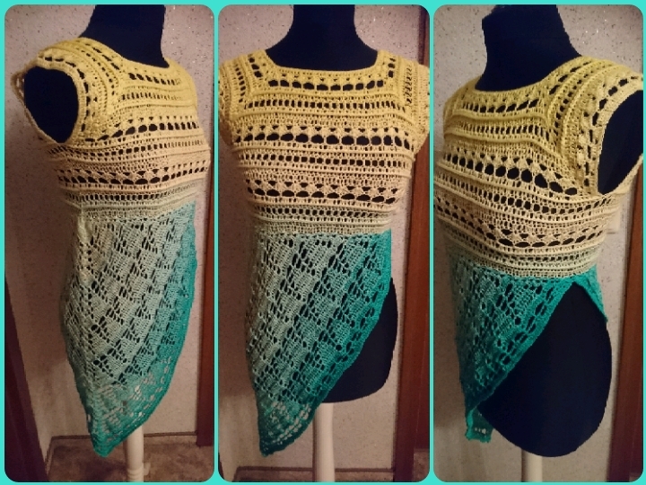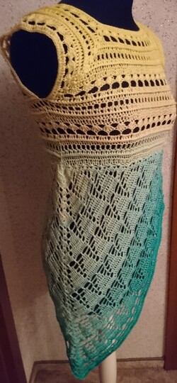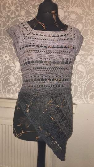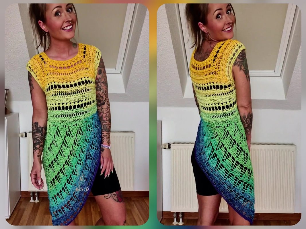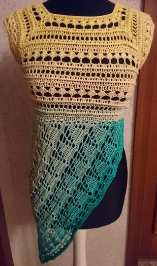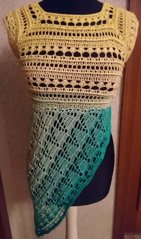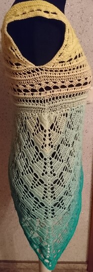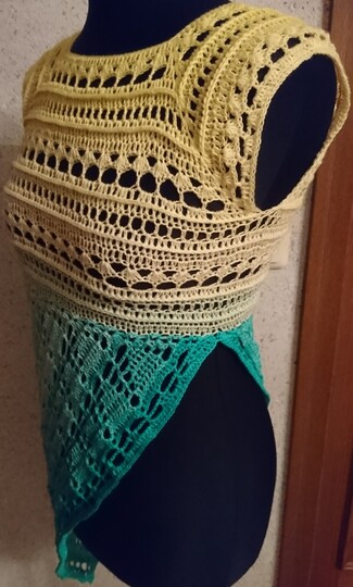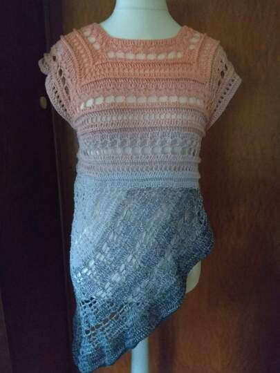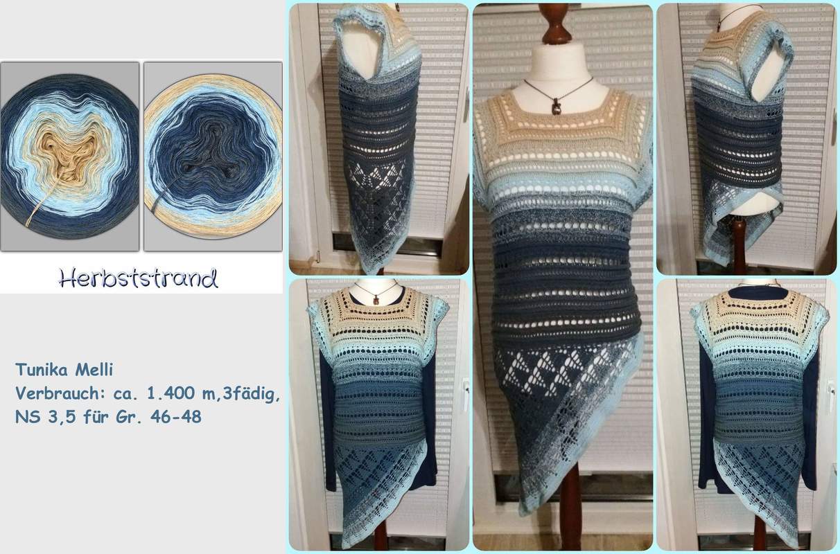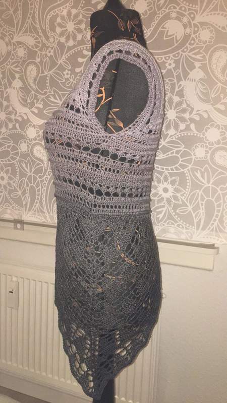 Je nach Größe und Länge, die Ihr arbeiten wollt, benötigt Ihr eine andere Menge an Garn. Dies ist in der Anleitung mit angegeben. Ich habe für Größe 36 750m eines Farbverlaufgarns benötigt.