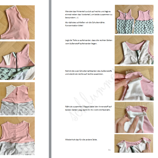 schlummerfluf kommt in Doppelgrößen und passt von 50/56-110/116, denn auch große Kinder wollen einen schlummerfluff. ???? Das eBook zeigt auf über 60 Seiten wie immer verschiedenste Varianten und Verarbeitungsoptionen. Unter anderem könnt ihr schlummerfluff einlagig, doppellagig oder wattiert nähen; verstürzt, mit Umschlagbündchen, mit normalen Bündchen oder schick eingefasst; mit Gummizug oder Kordel und Stopper am Bein. Alle Varianten werden beschrieben.