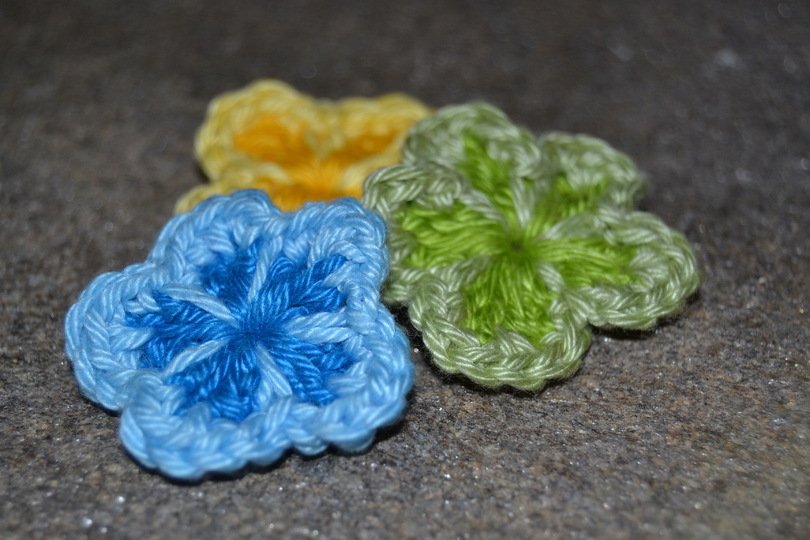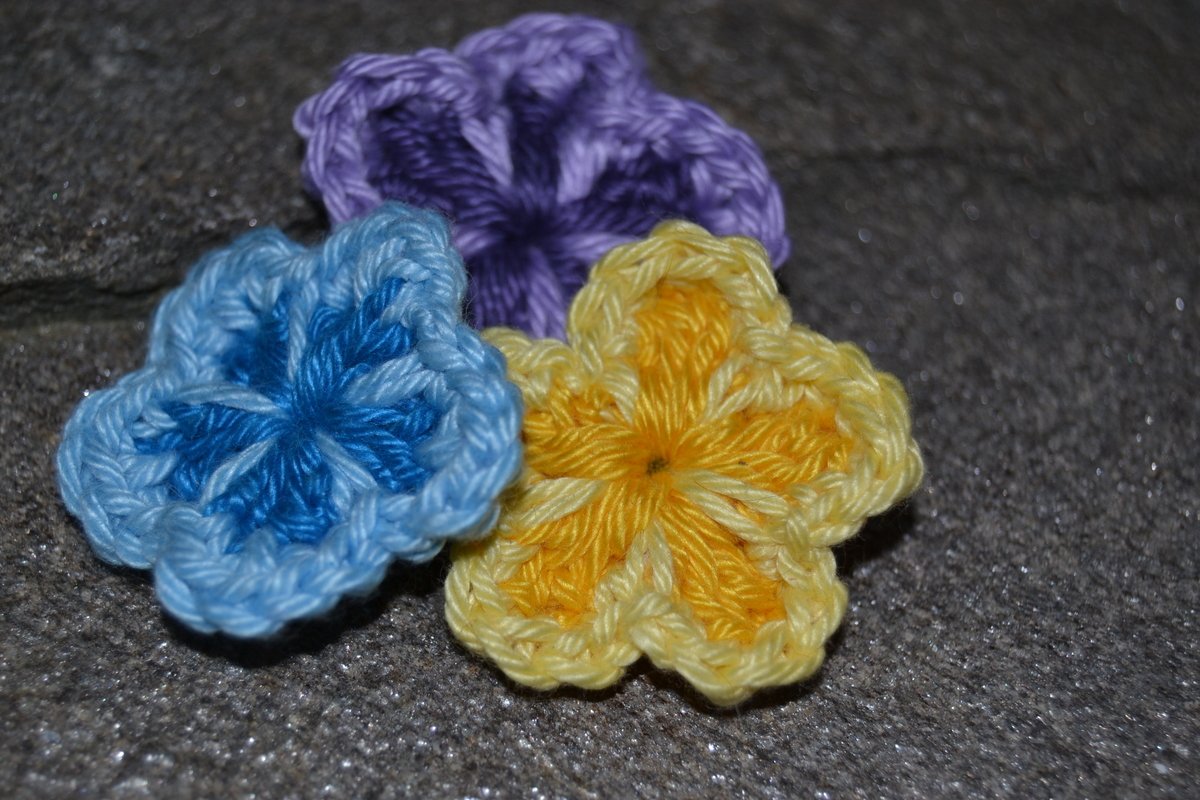 Eine schnelle Idee um Geschenke zu verschönern, Tischdeko zu arbeiten oder farbige Akzente für Mütze und Schals zu zaubern. Hier sind sie zweifarbig mit aufeinander abgestimmte Farben gehäkelt. Durch verschiedenes Einstechen entsteht dieses Muster.