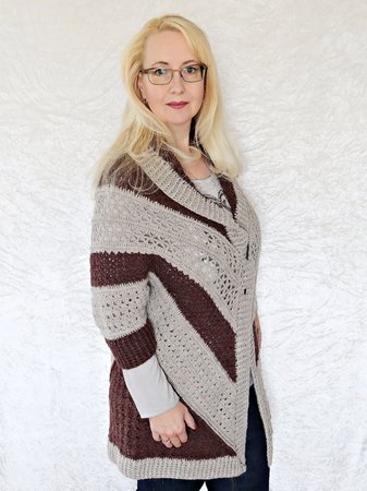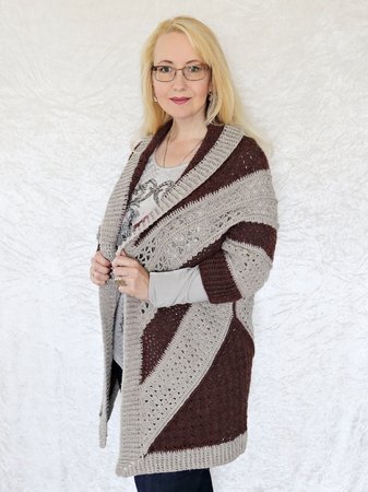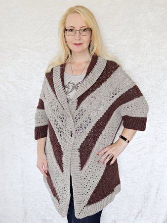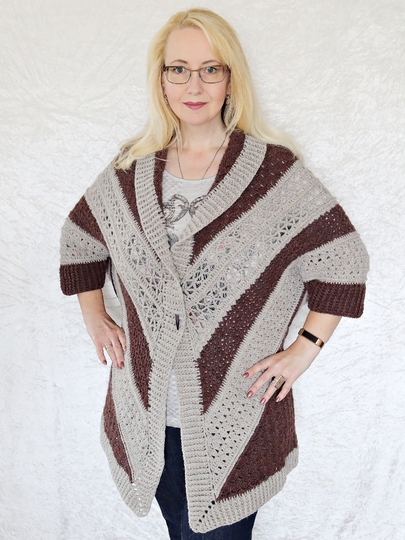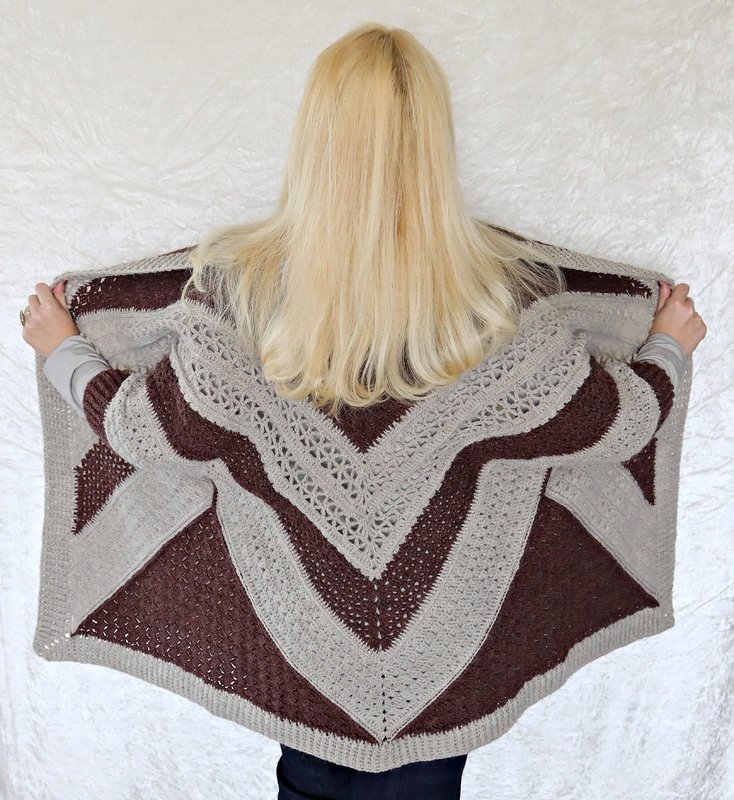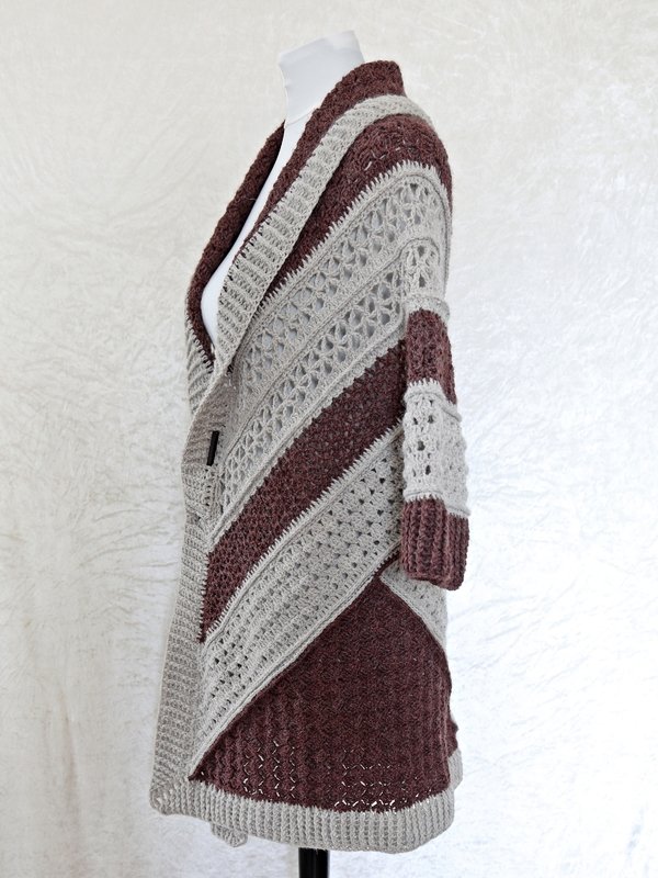 Mit dieser Anleitung kannst du dir ganz leicht eine schicke Jacke häkeln. Die Häkeljacke wurde aus der Anleitung für das Tuch „Karma“ entwickelt. Die Idee zu dieser Jacke stammt von meiner Testerin Simone Fricke, die mir die Erlaubnis erteilt hat, daraus eine Anleitung zu entwickeln. Der Aufbau sorgt für einen tollen Tragekomfort und dafür, dass die Jacke in jeder beliebigen Konfektionsgröße nachgearbeitet werden kann.