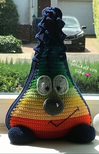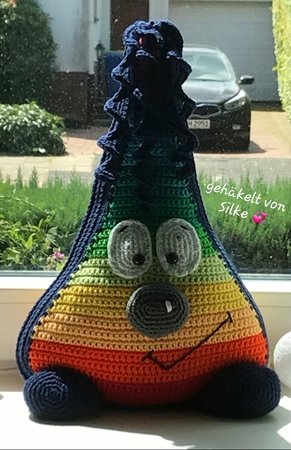 Der Tropfenwichtel wurde mit Baumwollgarn (50g-125m) und einer 2,5 Nadel gehäkelt, er ist ca. 32cm hoch.