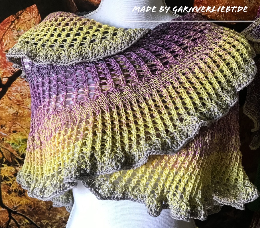 Ein einfach zu strickendes Halbmondtuch, das recht variabel in der Wollauswahl ist. Es kann beliebig verkleinert, oder ggf vergrößert werden und hat damit sehr viel Spielraum.