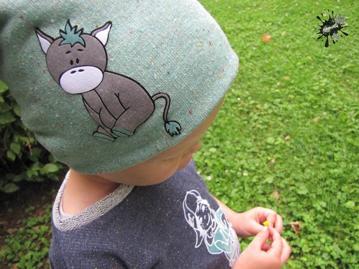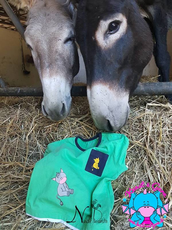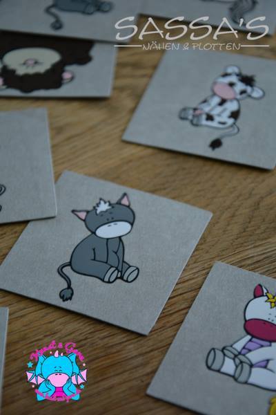Der kleine Esel macht sich als Plott ganz toll auf einem Memory, auf Schlüsselanhängern, als Luftballonhüllen und besonders auch auf Halstüchern.