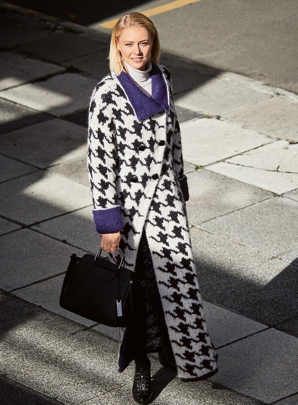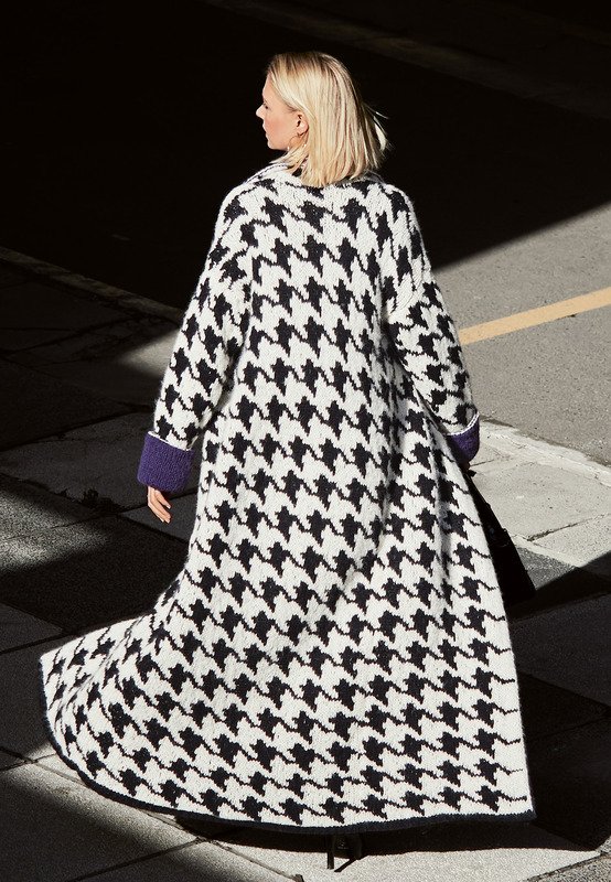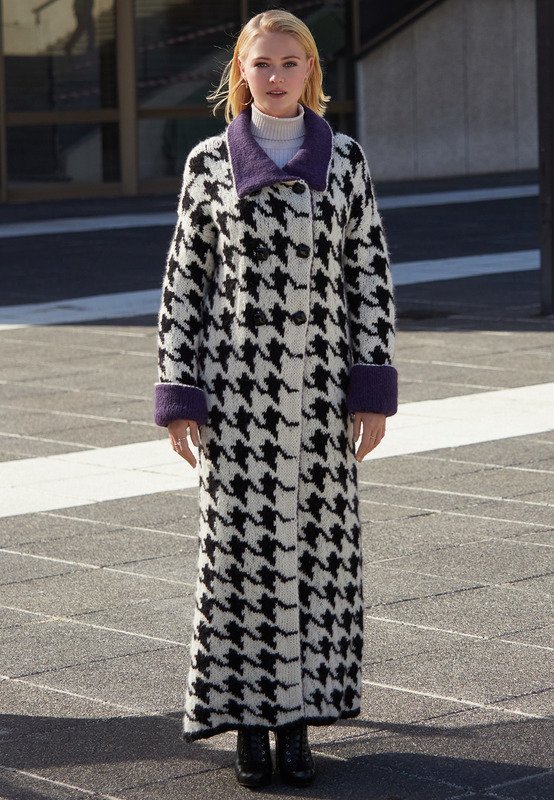So ein Statement-Teil - können wir im Herbst gut gebrauchen! Coole Maxilänge, auffälliges Hahnentritt-Muster und die It-Farbe dieses Winters, nämlich Lila, lassen uns bei diesem Schmuckstück die viele Arbeit schnell vergessen.