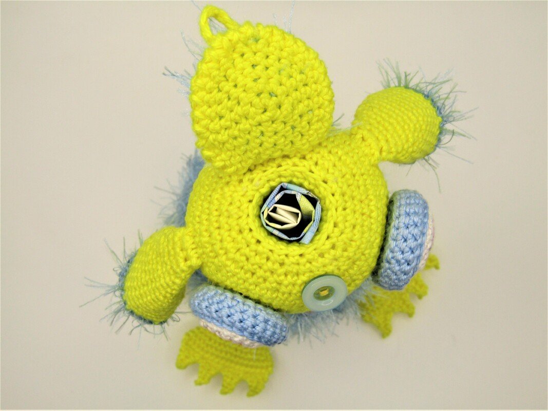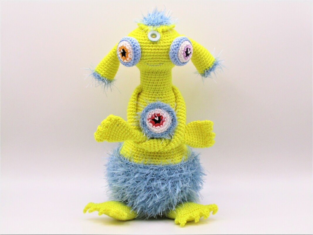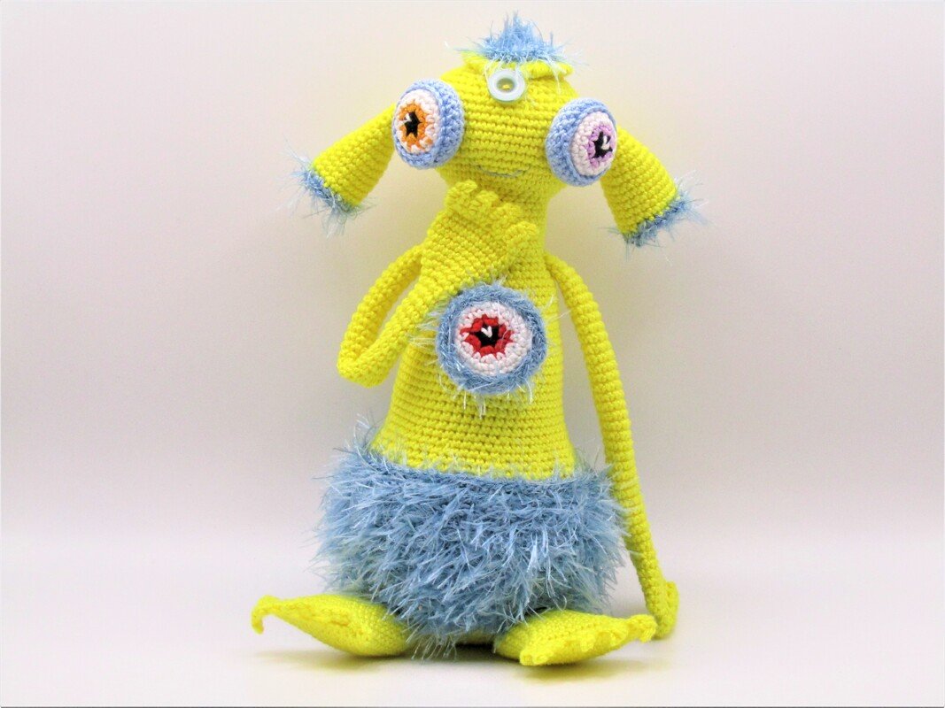 Der Körper wird mit 100%igem Baumwollgarn gehäkelt und danach mit Fusselgarn in das vordere Maschenglied behäkelt! Das macht es leichter mit Fusselgarn zu arbeiten.