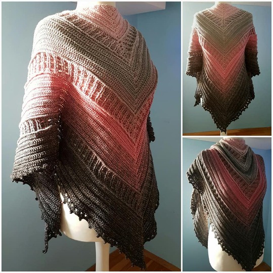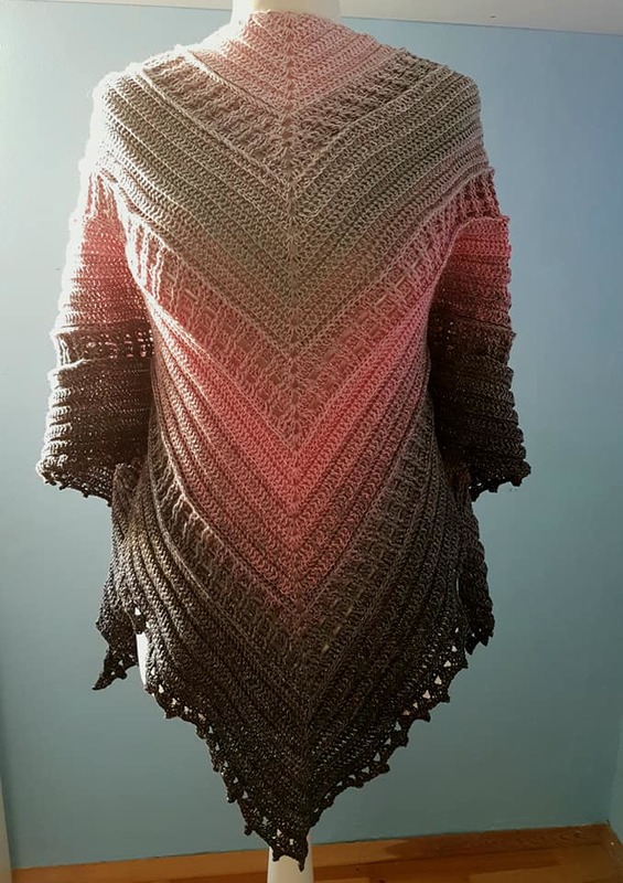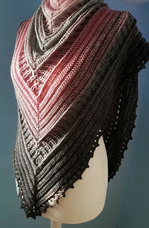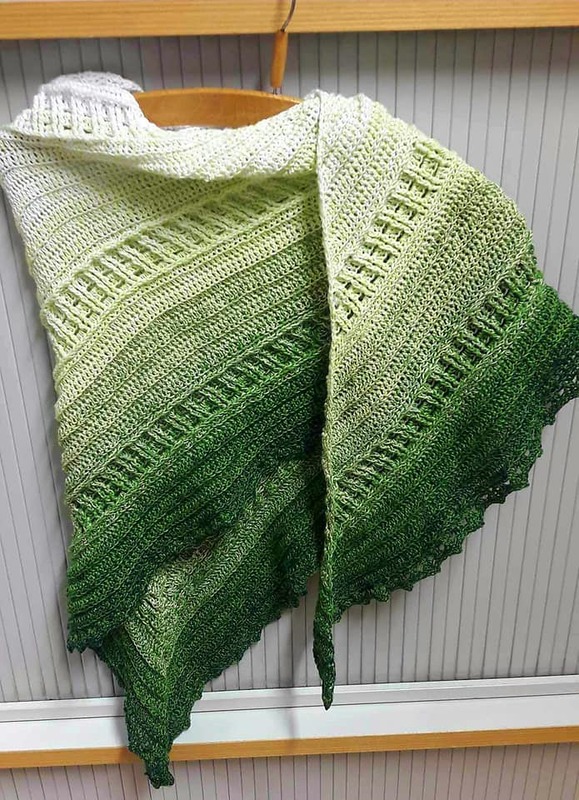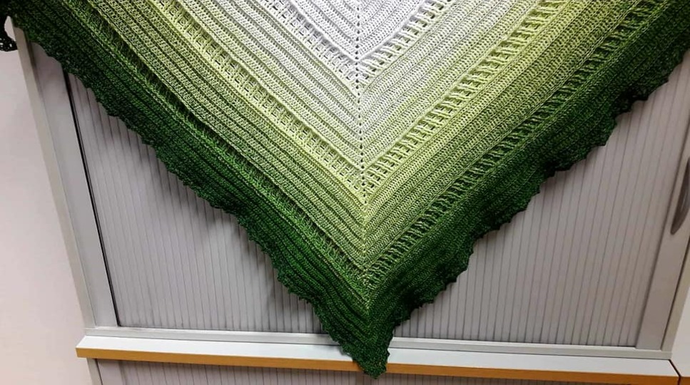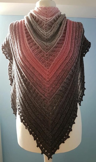 Das Tuch auf dem Bild wurde aus einem vierfädigen Bobbel mit 1200 Metern Lauflänge und einer Häkelnadel der Stärke 4 gehäkelt. Es ist 80 cm tief und 175 cm breit.