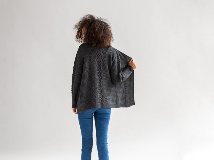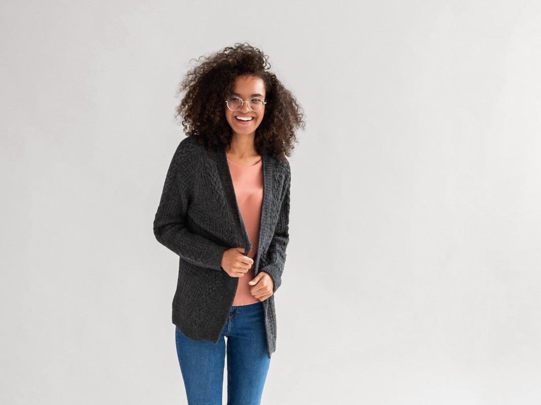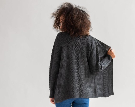 Stina ist eine richtig gemütlich Winterjacke für alle Liebhaber von Zopfmustern. Die Jacke wird von unten nach oben in einem Stück gestrickt. Sie hat Raglanärmel, einen leichten V-Ausschnitt und eine Sattelschulter. Das einfache Würfelmuster ist der perfekte Rahmen für die schönen Zopfmuster in Vorder- und Rückenteilen. Auch, wenn die Jacke sehr aufwändig aussieht, kann sie durchaus von fortgeschrittenen Anfängen gestrickt werden.