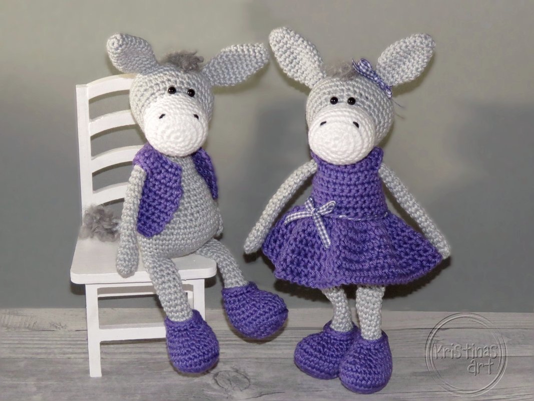 Bei Verwendung von Baumwollgarn mit einer Lauflänge von 125m/50g (z.B. Catania von Schachenmayr) und einer Häkelnadel Stärke 2 werden die Esel 22 cm groß