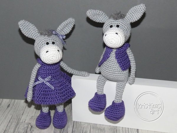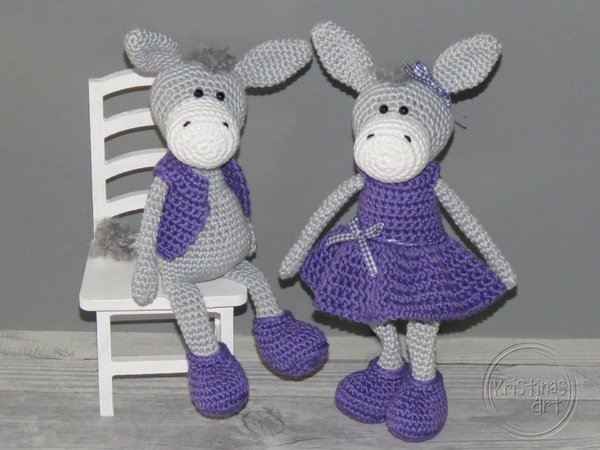 Bei Verwendung von Baumwollgarn mit einer Lauflänge von 125m/50g (z.B. Catania von Schachenmayr) und einer Häkelnadel Stärke 2 werden die Esel 22 cm groß