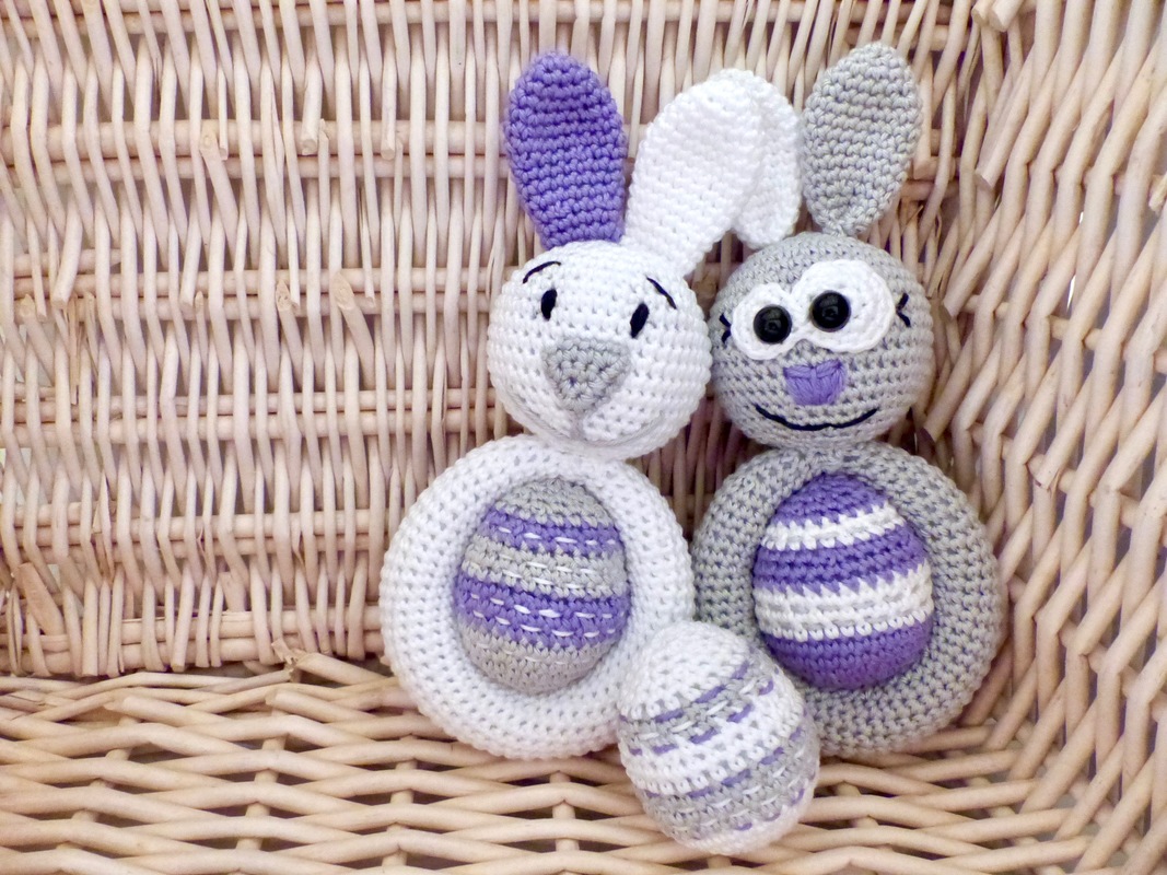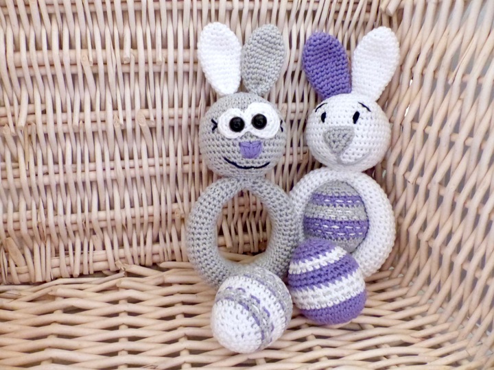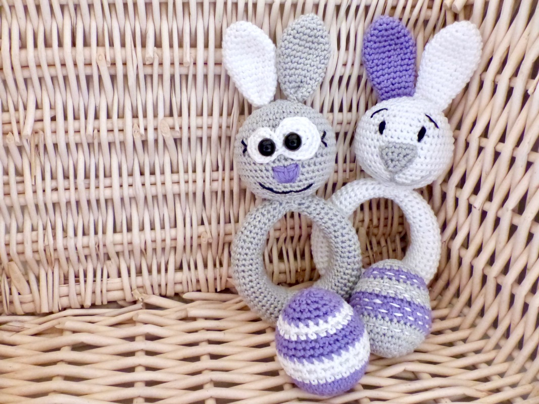 Diese Anleitung für einen Greifling beinhaltet den Hasen und ein separat zu häkelndes Ei. Beide sind in der Größe aufeinander abgestimmt, sodass am Ende zwei Rasseln dabei entstehen, dabei passt das Ei exakt in den Hasenkörper.