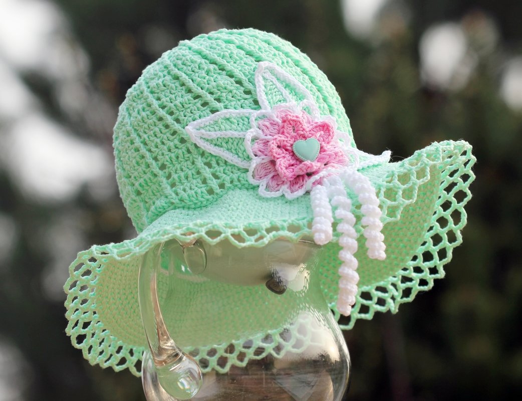 Ihr erhaltet eine 13-seitige erklärende und bebilderte Schritt-für-Schritt-Anleitung zur Anfertigung dieser romantischen Sommermütze für kleine Mädchen (Kopfumfang 48 - 52 cm).