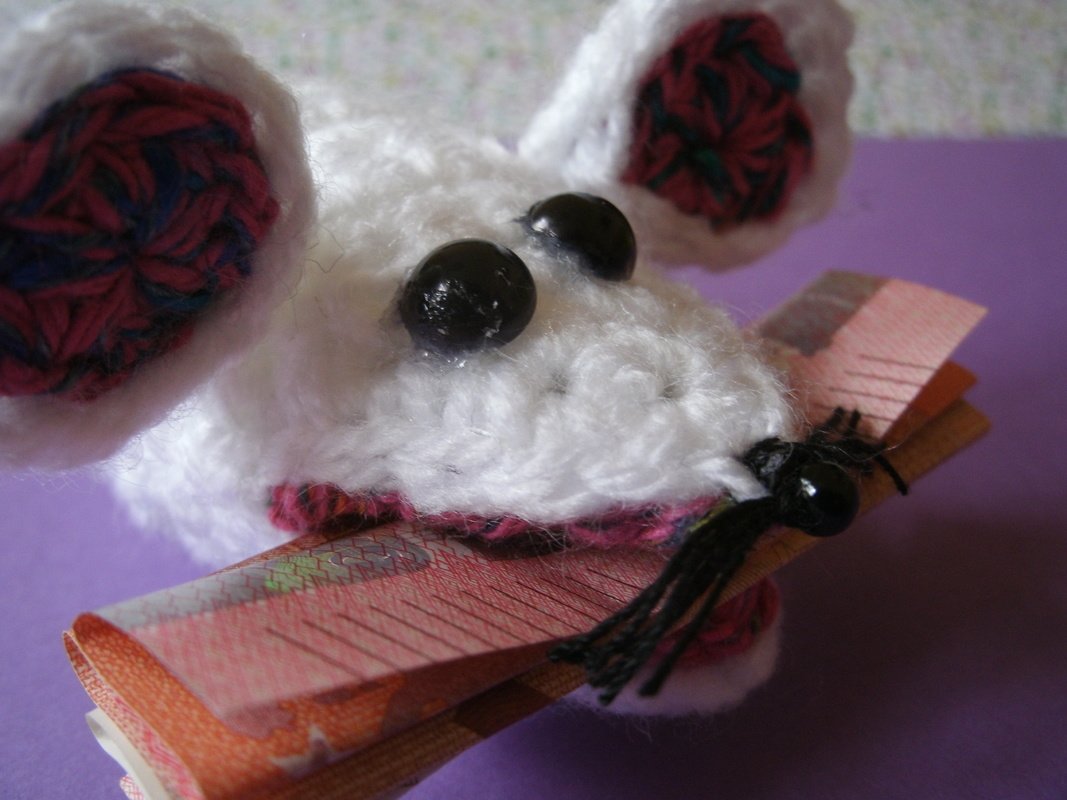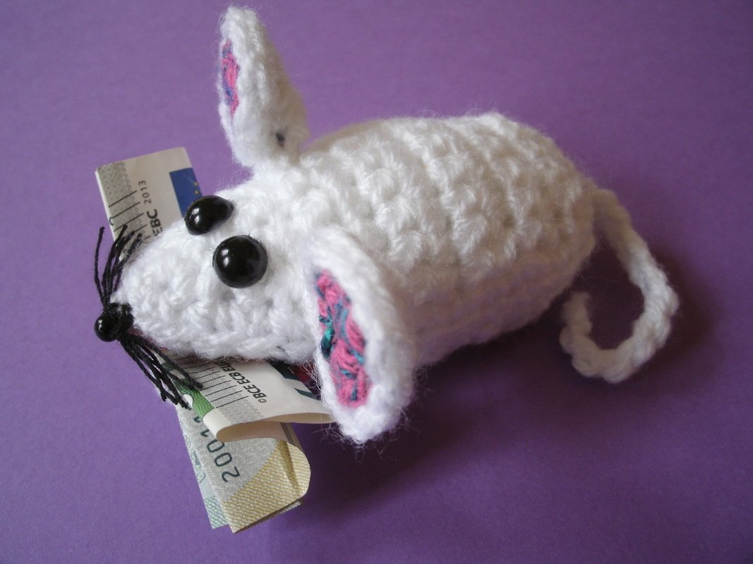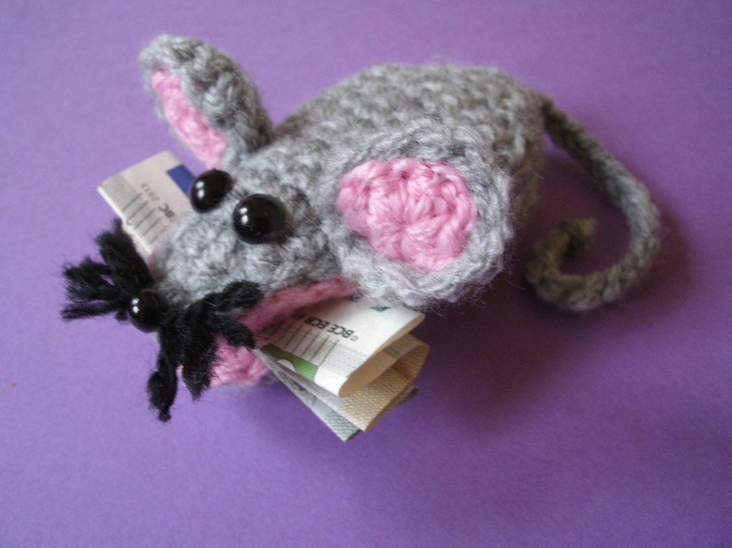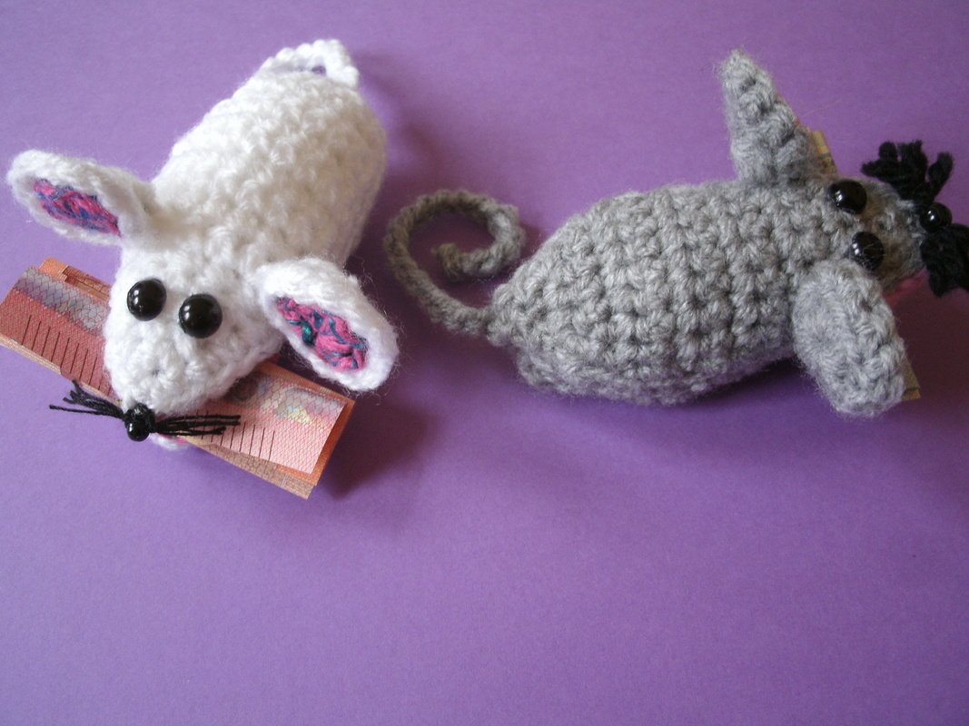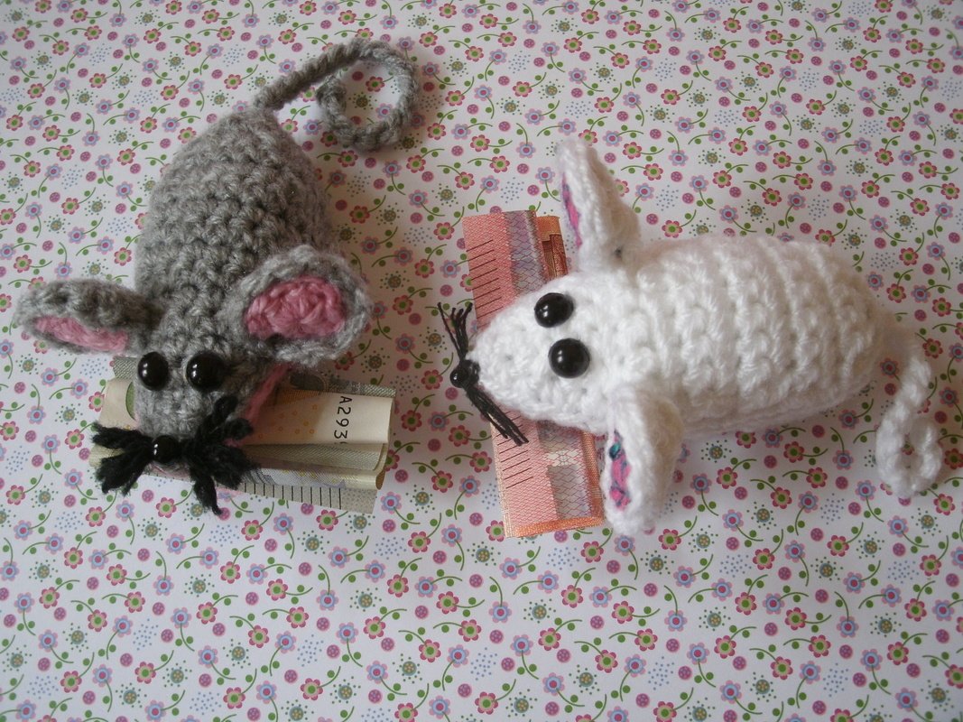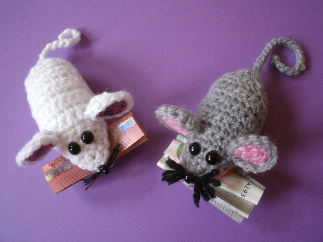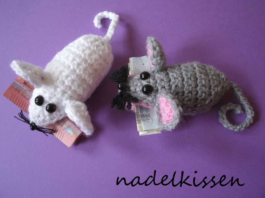 Häkelanleitung für süße kleine Klammermäuse, die kleine Geschenke fest im Mäulchen halten.