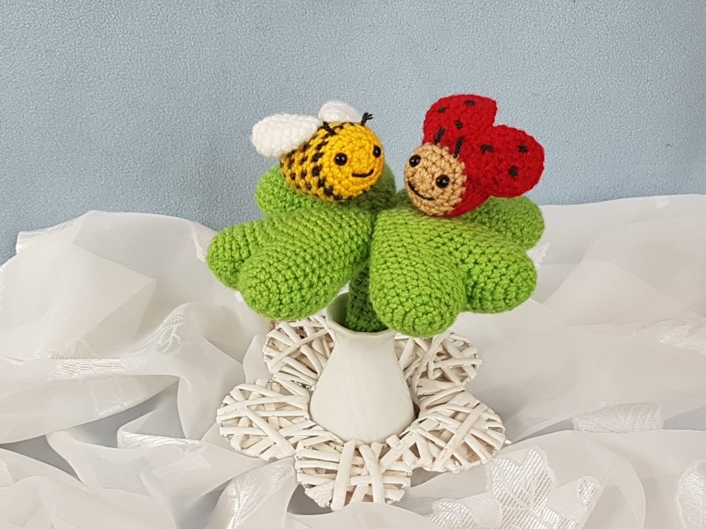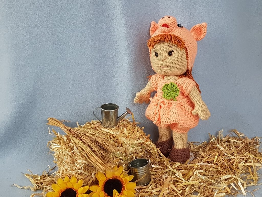 Die Kleidung passt Puppen von einer Größe von ca. 36 cm. Die PDF beinhaltet die Anleitung für das Hemd, die Pumphose, die Schuhe, die Schweinchenmütze, das große Kleeblatt, die Biene sowie für den Marienkäfer.