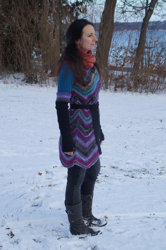 Am Halsausschnitt ist der Pulli assymetrisch mit einer Art Wasserfallkragen ausgestattet. Leider habe ich Idiot beim Fotografieren vergessen, den Schal auszuziehen, daher sieht man den Kragen nur auf zwei Bildern.