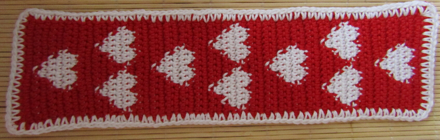 Dieses hübsche Lesezeichen in Herzoptik ist eine einfache Arbeit in Tapestry-Technik, die gut für Einsteiger geeignet ist, denn hier wird nur in zwei unterschiedlichen Farben, also mit 2 Fäden, gehäkelt.