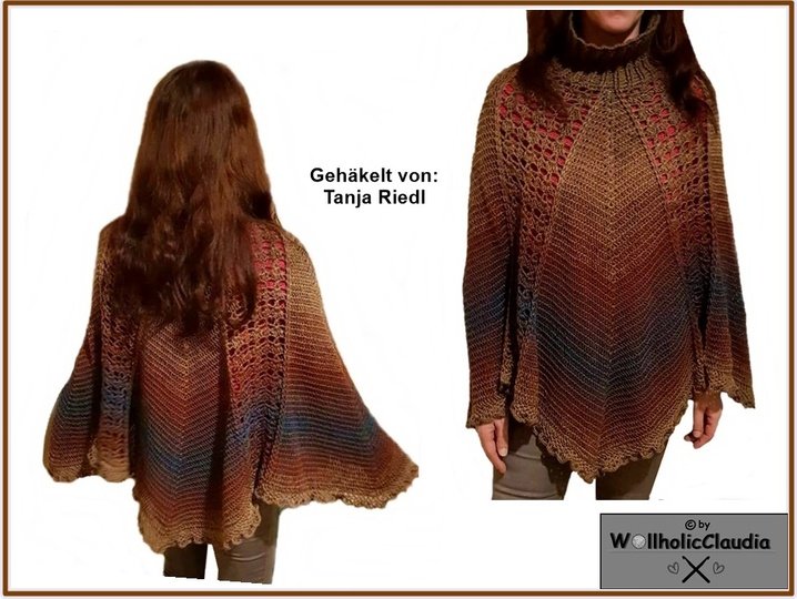 Bei angegebener Garn- und Nadelstärke hat der hier abgebildete Poncho eine Tiefe ( gemessen ohne Kragen, von Halsausschnitt bis Spitze ) von 0,75 m. Er kann selbstverständlich verkleinert bzw. vergrößert werden.