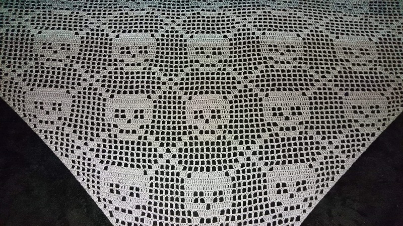 Die Anleitung ist auf 4 Seiten in teilweise Schrift (Erklärung Filethäkeln), der Anfang des Tuches in Pc-Häkelschrift und Zählraster geschrieben.