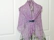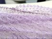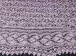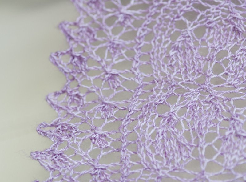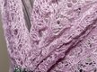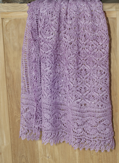 Bei diesem Tuch wurde eine historische Bordüre (“Harebell lace border” aus Weldon’s Practical Knitter) mit einer Variation des bekannten Haapsalu “Waterlily”-Musters kombiniert (auch als “Stern”-Muster bekannt). Verwendet habe ich ein feines Lacegarn aus 70 % Baby-Alpaka und 30 % Seide in einem Altrosa-Ton.
