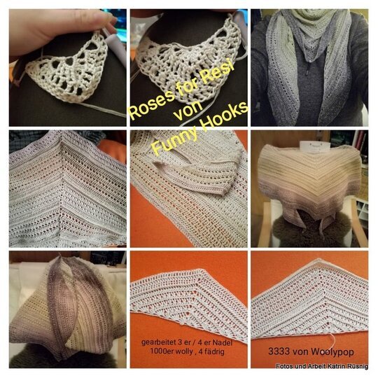 Das Tuch “Roses for Resi ” ist eine kleine Hommage an meine liebe 86 jährige Oma Therese (kurz Resi). Resi liebt Rosen und da es in dieser Anleitung auch Rosenstäbchen gibt, passt das wunderbar. Das Tuch besteht aus sich wiederholenden Mustersätzen.