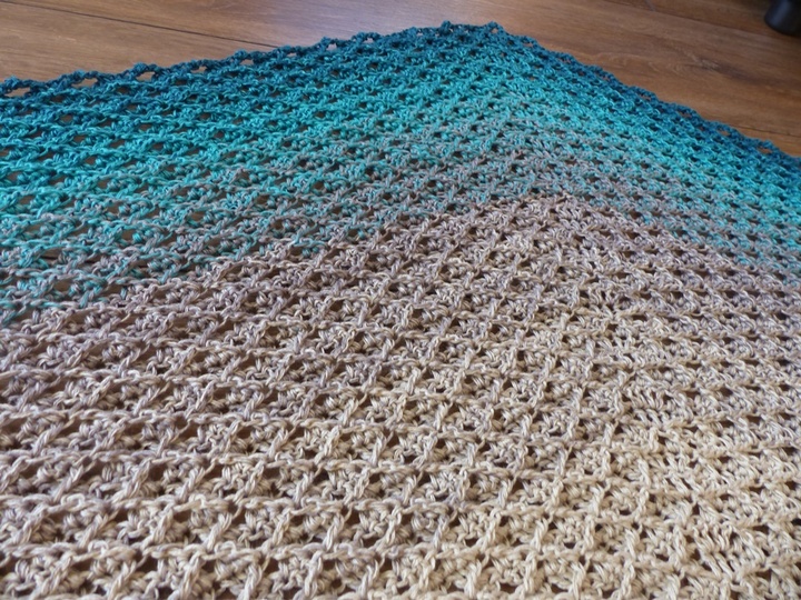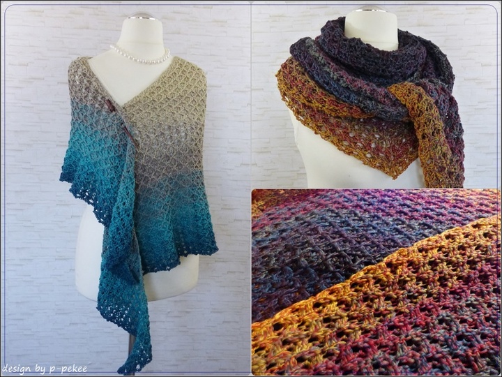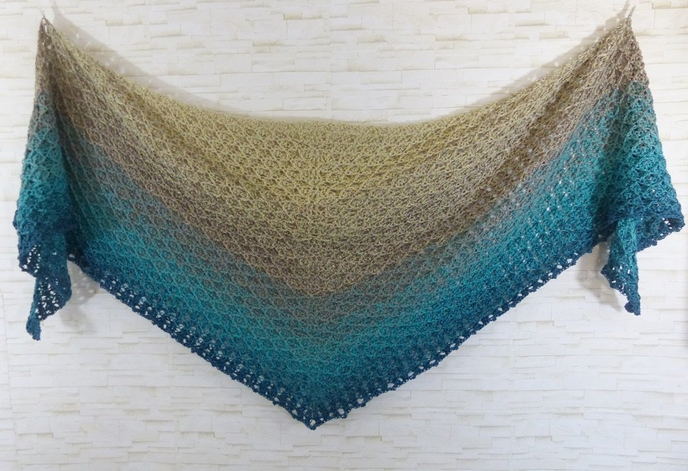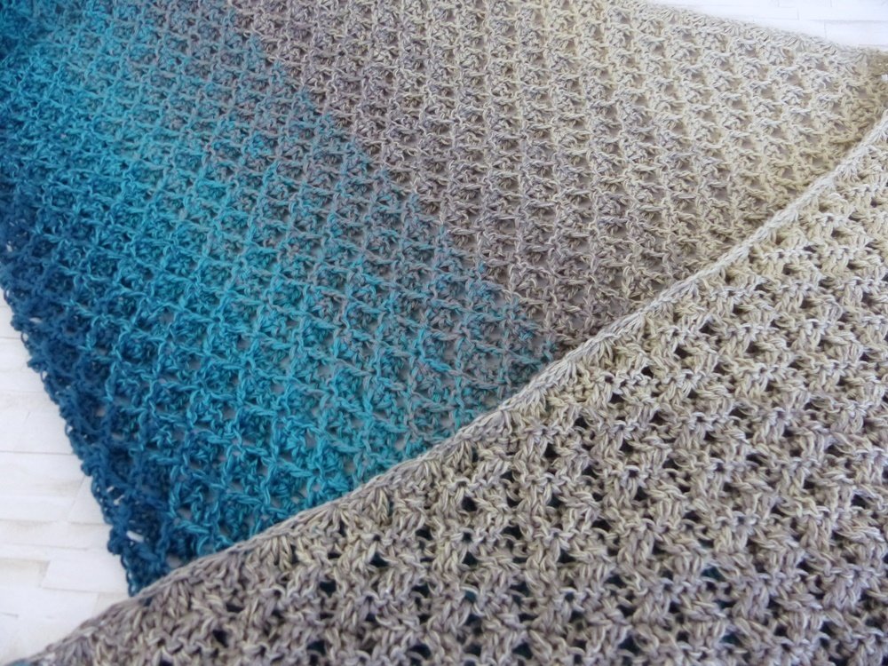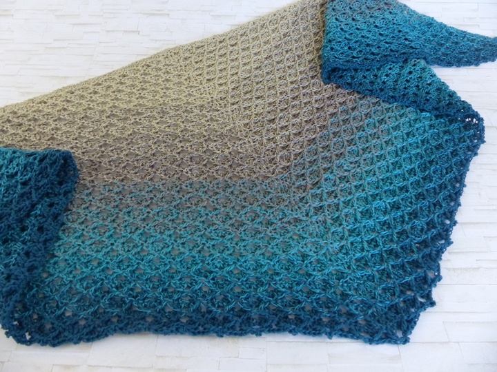 "TwoFaces 1.0" ist ein raffiniert gehäkeltes Tuch, da das Rautenmuster auf beiden Seiten unterschiedlich ist. Daher hat es auch der Name "zwei Gesichter". Das Dreieckstuch sieht von beiden Seiten schön aus.
