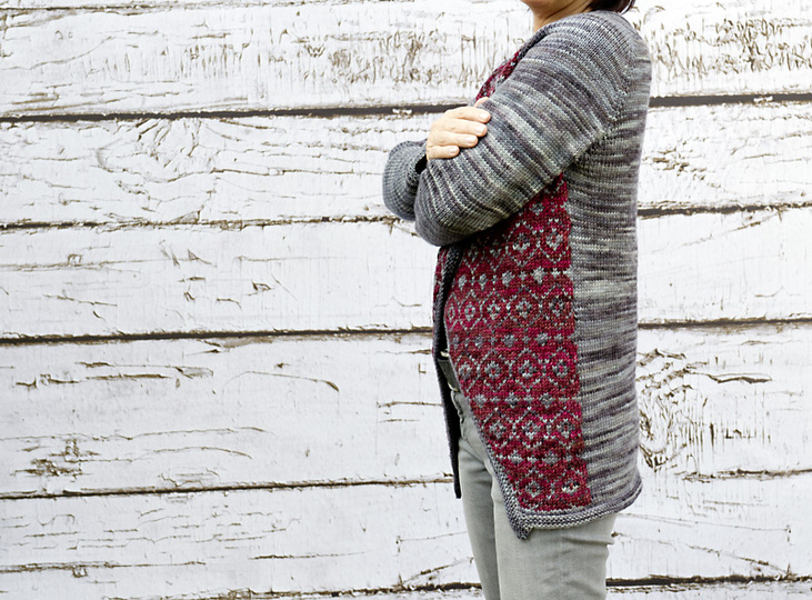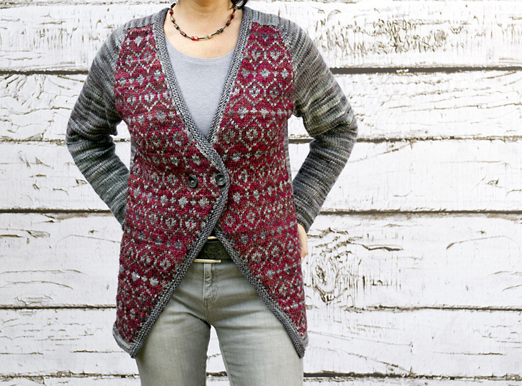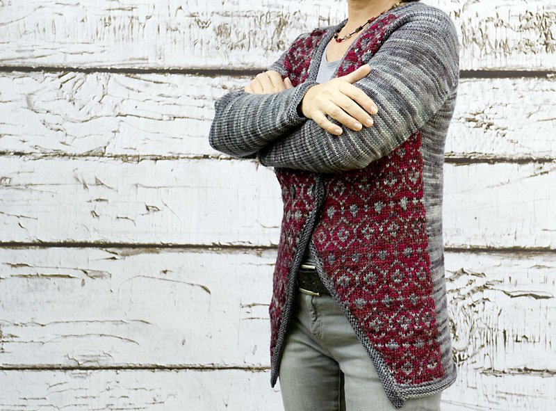 Für dieses Modell habe ich zwei handgefärbte Garne verrwendet, die nicht sehr stark kontrastieren. Wer das Einstrickmuster etwas deutlicher hervorheben möchte, kann natürlich auch einfarbige Garne mit stärkerem Kontrast wählen.