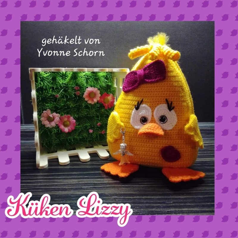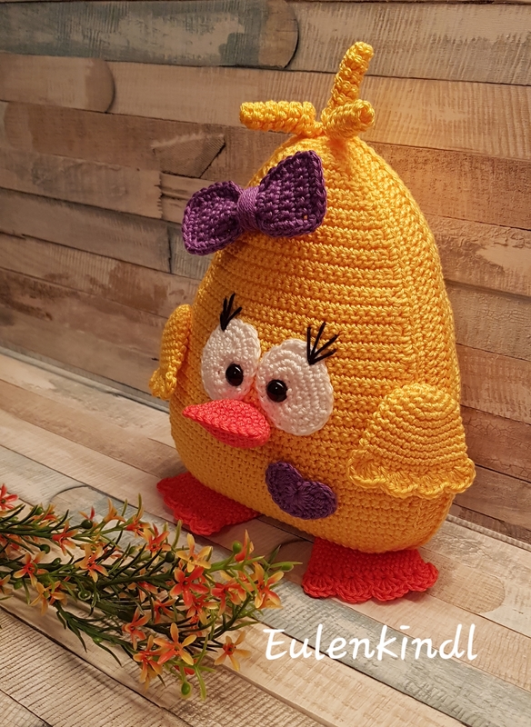 Das Küken wurde mit Baumwollgarn (50g-125m) und einer 2,5 Nadel gehäkelt, es ist mit Locken ca. 22cm hoch.