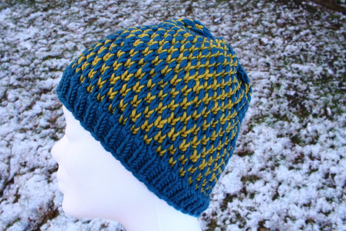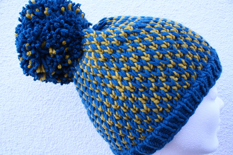 Das besondere ist, dass jede Runde in einer Farbe gestrickt wird. Es ist also kein Wechsel zwischen den Farben nötig. Kenntnisse im Umgang mit rechten und linken Maschen sowie dem Abnehmen werden für diese Anleitung vorausgesetzt. Ihr benötigt außerdem zwei Nadelspiele Nr 3,5 und 5, ein Maßband und eine Stopfnadel sowie Wollen in zwei Farben. Für einen Kopfumfang von 54cm habe ich 200g Wolle (Bommel inklusive) gebraucht. Wie viel Wolle ihr am Ende aber genau verwenden müsst, wird ebenfalls erklärt.