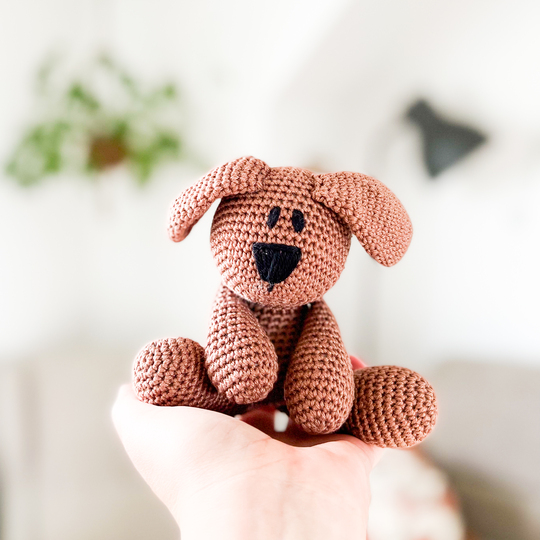Die Nase des Hundes wird nicht gehäkelt, sondern mit schwarzem Garn aufgestickt.