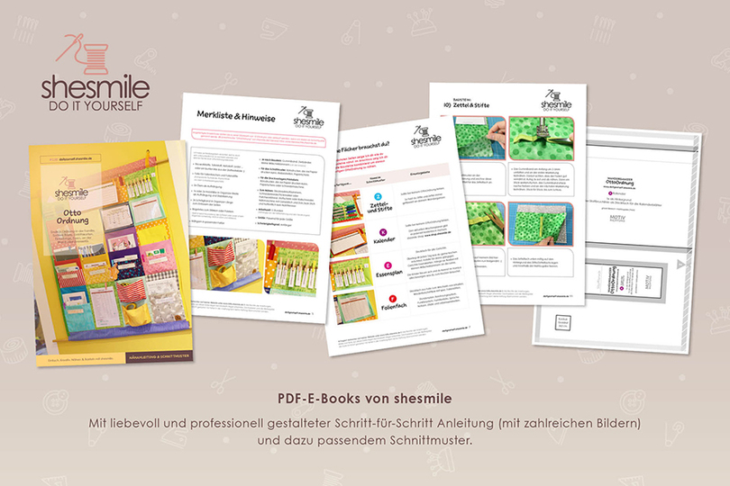 PDF-E-Books von shesmile: Diese leicht verständliche Schritt-für-Schritt-Anleitung mit vielen Fotos ist auch für Nähanfänger geeignet, denn die sehr ausführliche Fotoanleitungen begleitet dich bei jedem Schritt.