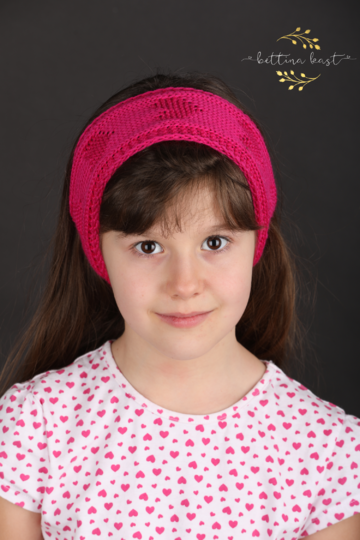Isabella ist ein Haarband durchgehend mit eingestrickten Herzchen dekoriert.