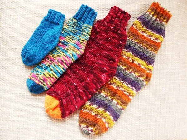 Gestrickt habe ich in vier verschiedenen Größen: für Babys, für Kinder, für Damen und für Herren. Ich bin hier von der Lauflänge der normalen Sockenwolle ausgegangen. Wenn dickere Wolle oder eine andere Nadelstärke verwendet wird, empfehle ich, vorher eine Maschenprobe zu stricken und die Maschen entsprechend anzuschlagen. Du findest in der Anleitung eine Tabelle mit verschiedenen Beispielen.