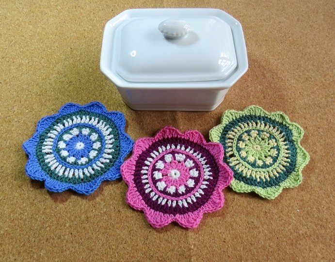 Glasuntersetzer aus schönen bunten Resten gehäkelt, das geht immer. Such dir einige Reste aus dünner Baumwolle und dazu die Häkelnadel Nr. 3 oder 2,5 und schon kann es losgehen.