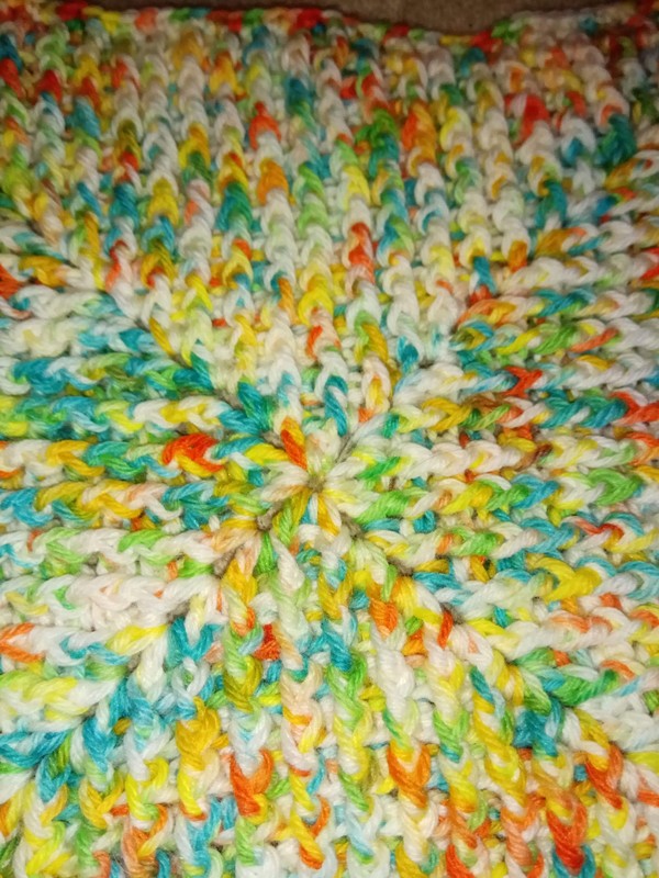 Die Häkelschrift hat in jeder Reihe eine andere Farbe.