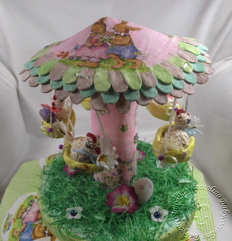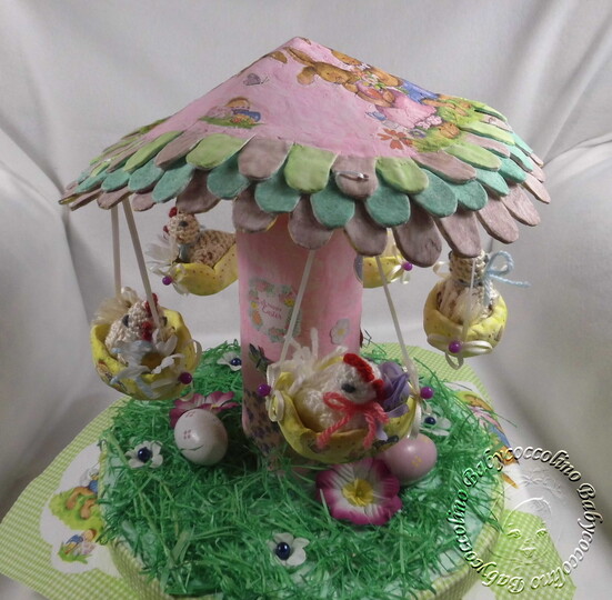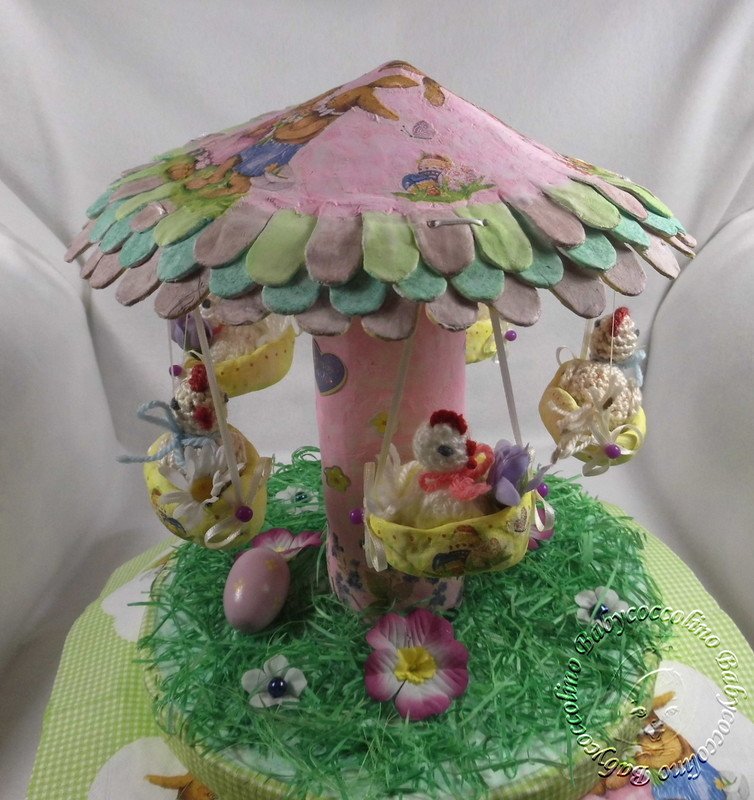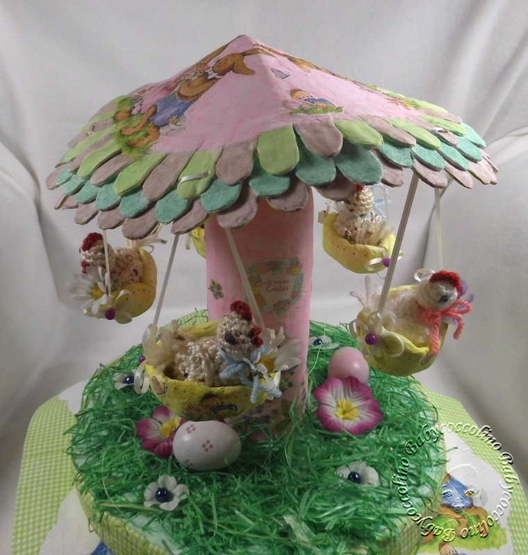 Heute zeige ich euch wie man aus Kleinigkeiten die man als Bastler sowieso immer zu Hause hat, dieses süsse Karussell bastelt. Ich habe kleine Küken gehäkelt und sie hinein gesetzt. Natürlich könnt ihr die Gondeln auch mit Häschen, Püppchen, Blumen oder was euch sonst noch so einfällt schmücken.