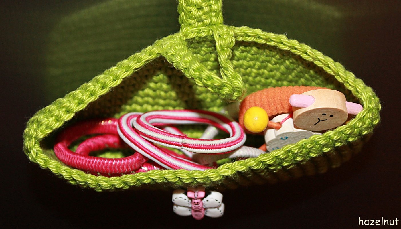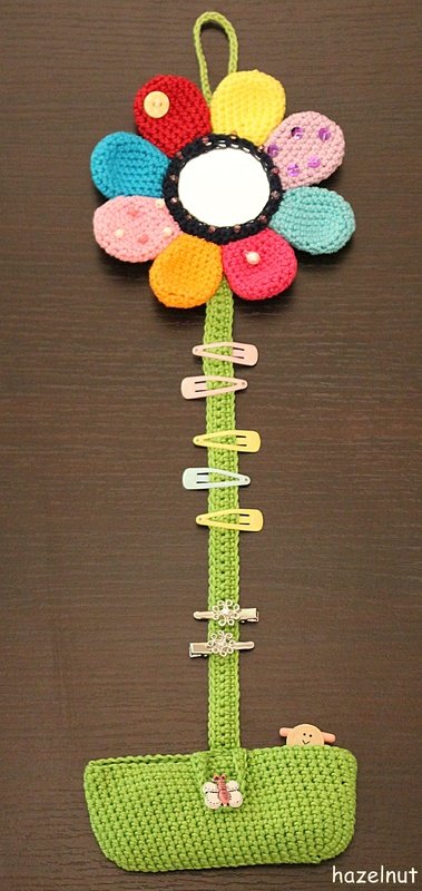 In dem Haarspangenhalter ist ein kleiner Spiegel integriert. Die Perlen werden als Verzierung eingehäkelt.