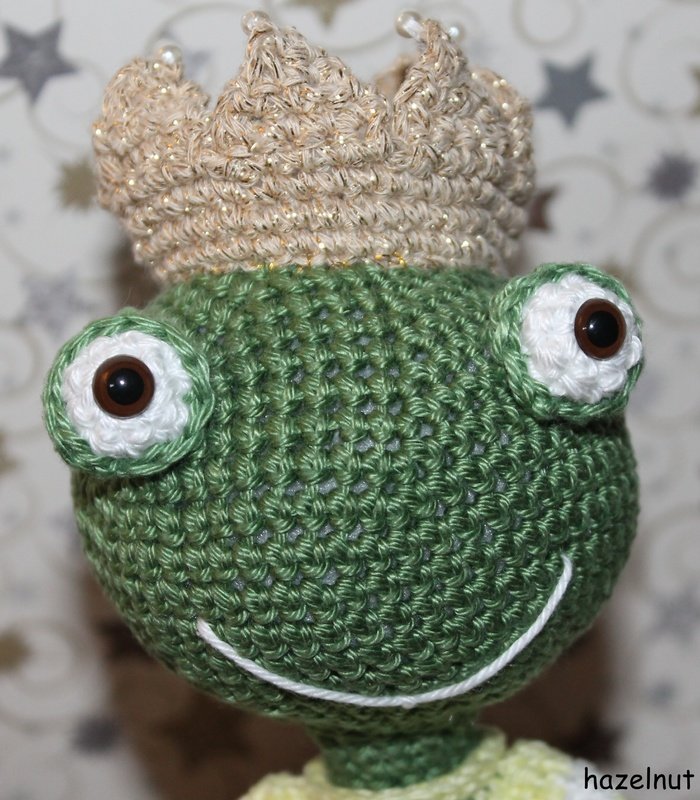 Ich habe den Frosch mit dem Baumwollgarn Schachenmayr Catania und der Häkelnadel 2,5 gehäkelt. Der Frosch wird dann ca. 17 cm hoch.