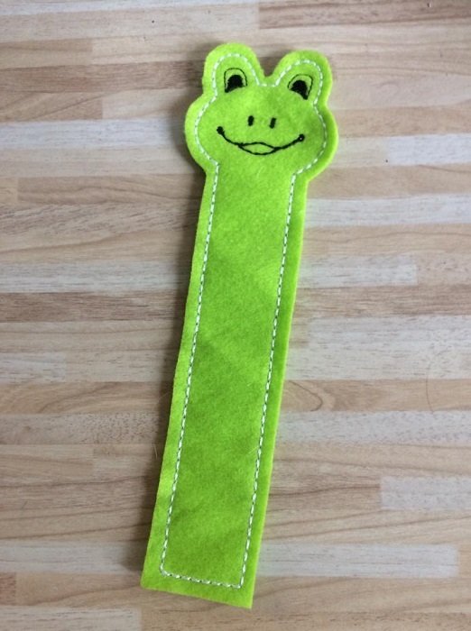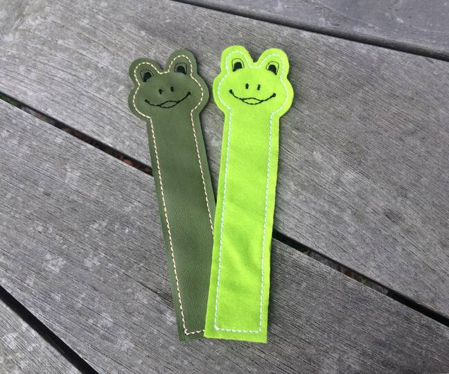 Der kleine Frosch als Lesezeichen-Datei d.h. es wird komplett in der Stickmaschine hergestellt.