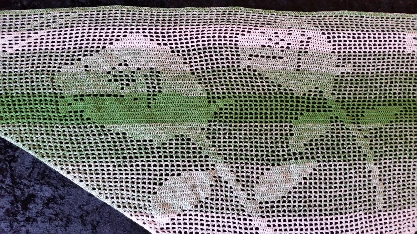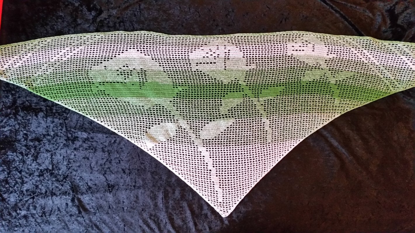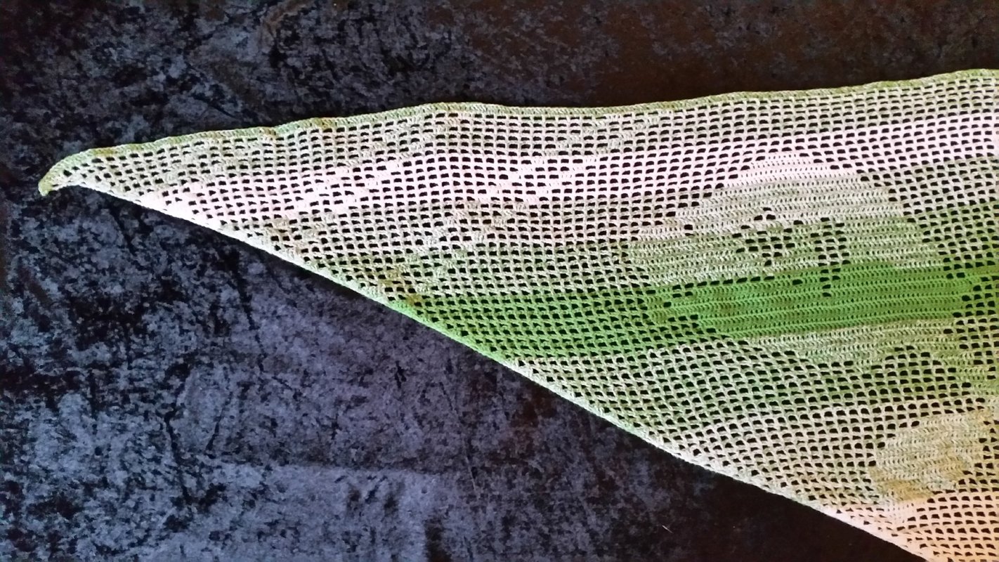 Ich habe das Motivtuch mit einem dreifädigen Farbverlaufsgarn gehäkelt, welches ich selbst gewickelt habe. Verwendet wurde ein Bobbel mit 1100m Lauflänge. Gehäkelt wurde mit einer Häkelnadel mit der Stärke 3,0.