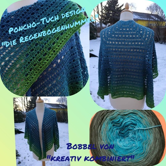 Material kann jedes beliebige benutz werden. Ich hab einen 1000m Bobbel mit 3 Fäden und Nadelstärke 3,5 verwendet. Das Tuch hat eine Größe von 105cm-58cm. Je nach Material wird es größer.