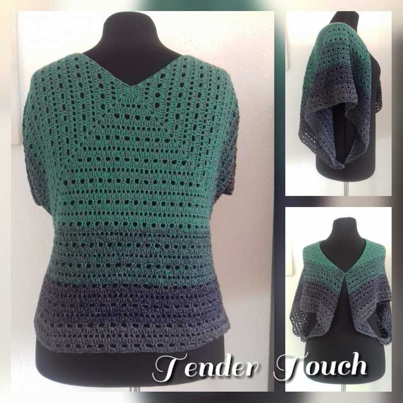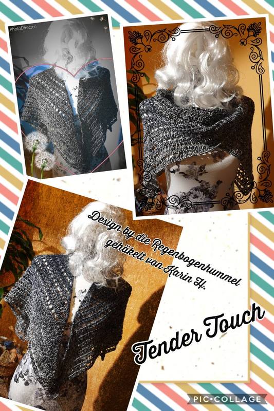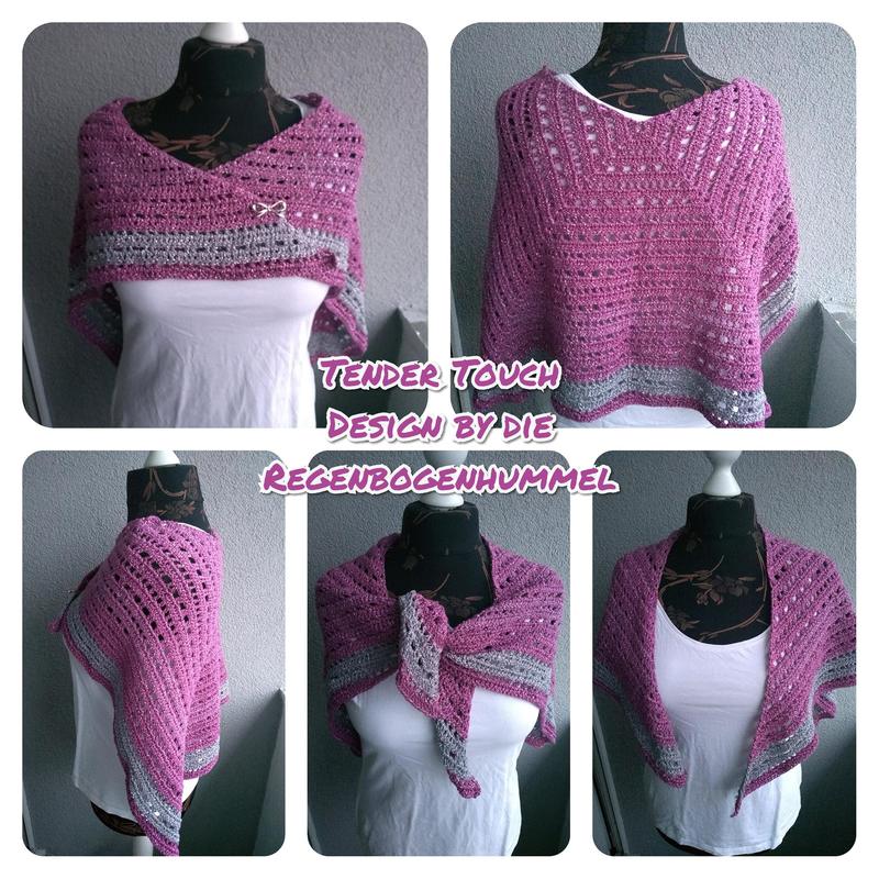 Tender Touch ist ein etwas anderes Tuch. Mit seiner speziellen Form ist es vielfach einsetzbar. Es kann als normales Tuch, als Poncho ersatz oder als Tuchweste getragen werden. Macht euch einfach selbst ein Bild :-)