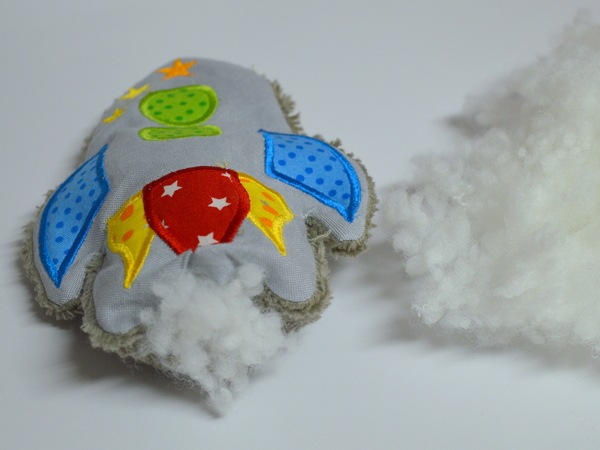 Nach dem Sticken einfach rund herum ausschneiden, durch die Wendeöffnung wenden, mit Polyesterwatte und evtl. einer Rassel füllen. Geschlossen wird die Rakete von Hand durch einen Matratzenstich oder näht sie mit der Nähmaschine zu.