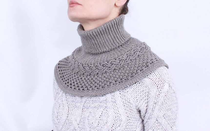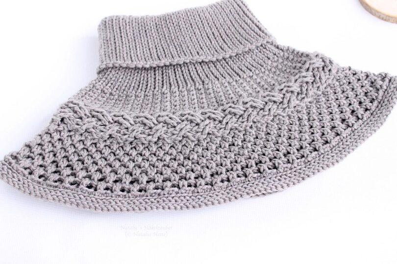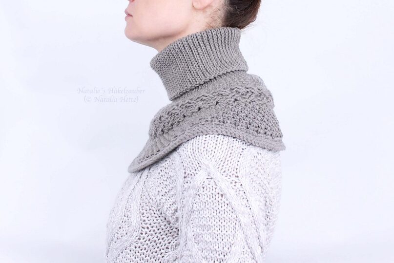Diese PDF-Häkelanleitung besteht aus bebilderter Anleitung zum Häkeln eines Schalkragens mit dem Zopfmuster um den Hals herum. Das Bündchen sieht wie gestrickt aus. Der Schalkragen ist sehr warm und passt genau richtig für die kalte Wintertagen.