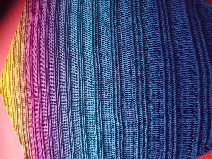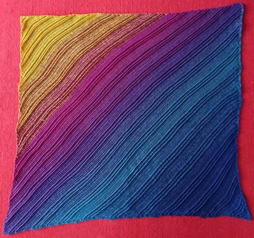 Ich habe die Decke aus 1200m Farbverlaufsgarn gehäkelt. Daraus entstand eine Decke mit den Maßen 100x100cm.