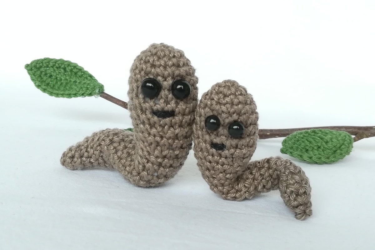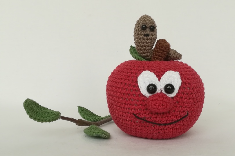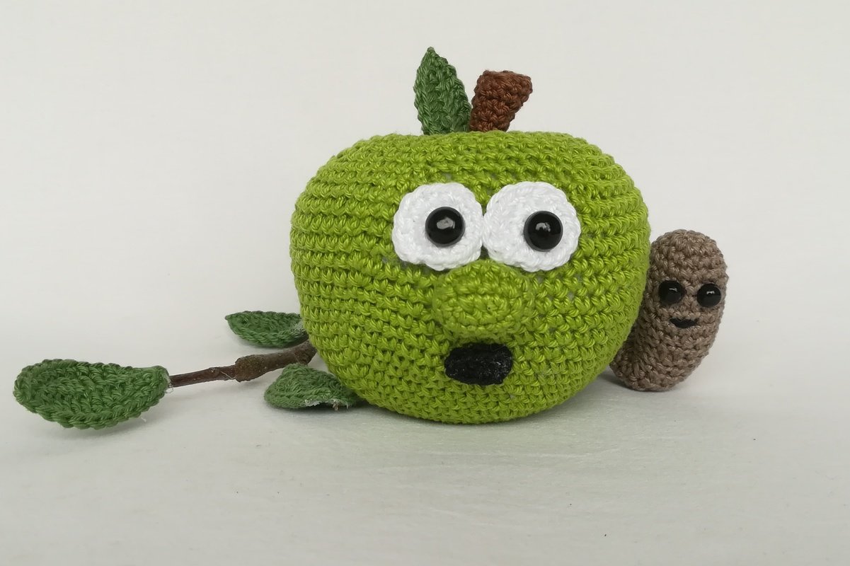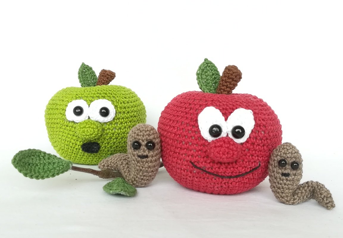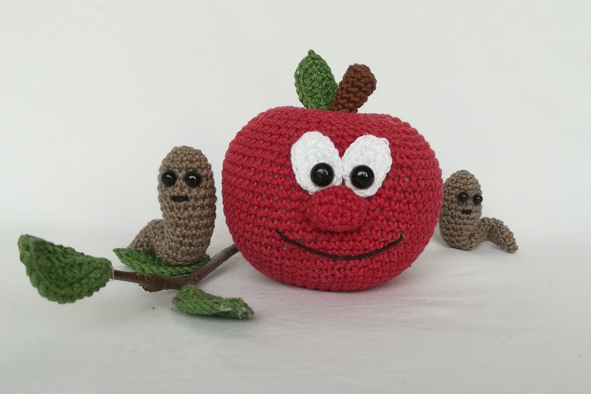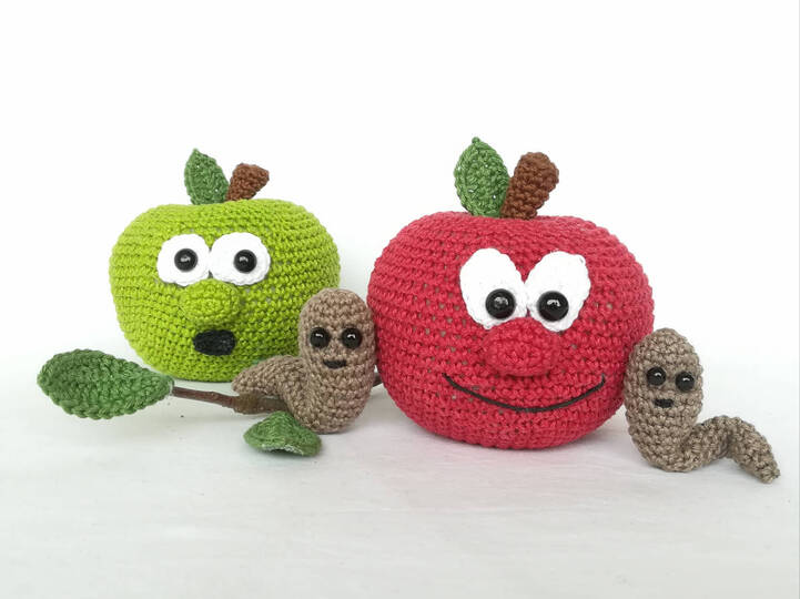 Die PDF enthält eine Häkelanleitung für die Apfel mit Gesicht und zwei verschieden großen Würmern.