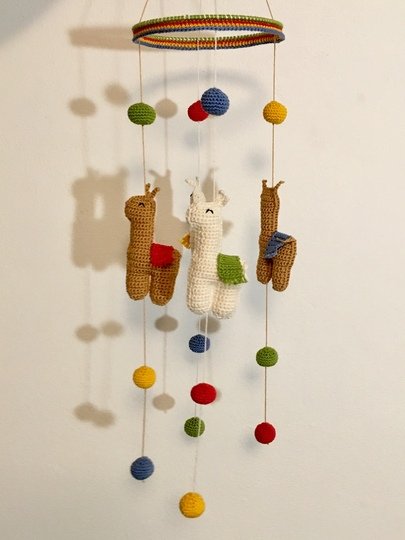 Das Mobile wird bei Verwendung der angegebenen Materialien ca. 75 cm groß (je nach Abstand der einzelnen Elemente). Die Lamas sind ca. 12 cm hoch.