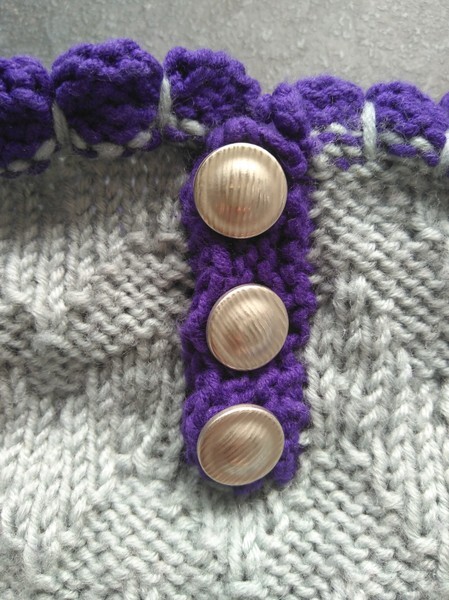 mit einre Knopfleiste und einem spez. Kragen. Das Zackenmuster zieht sich zusammen beim stricken und die fertige Grösse ergibt sich erst beim Dämpfen mit dem Bügeleisen.