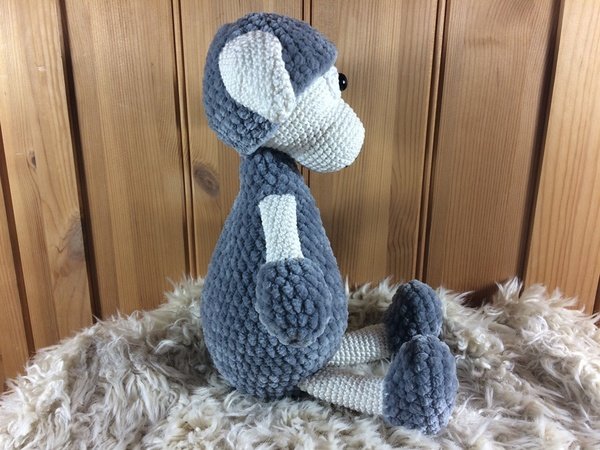 Das Schaf ist mit der angegebenen Wolle und der entsprechenden Nadelstärke sitzend ca.20cm groß.