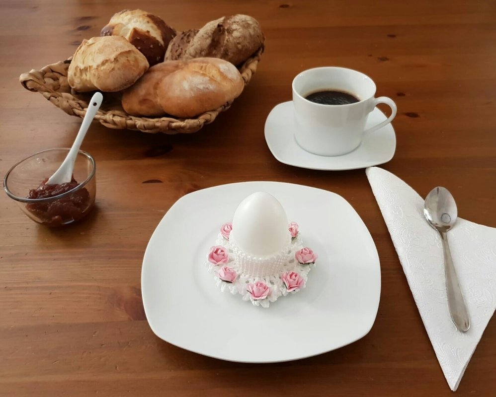 Häkelanleitung für einen zuckersüßen Rosen-Eierbecher, gehäkelt aus festen Maschen und Stäbchen.