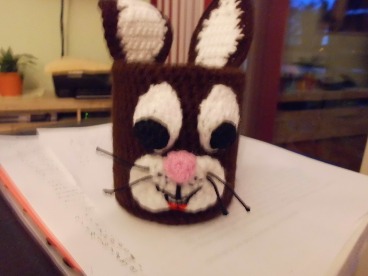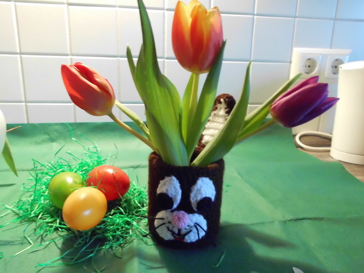 Ich habe eine Dose umhäkelt mit Oster-Motiv, dem Hasen. Er stellt eine nützliche Deko da, kann als Vase, Osternest oder zur Aufbewahrung von Buntstiften und Pinseln benutzt werden.