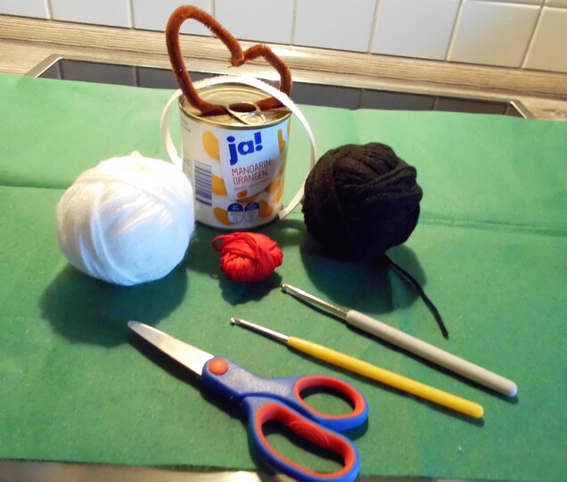 Du brauchst : Wolle in schwarz,weiß ,rot und rosa (Lisa Gründl 133m/50g)